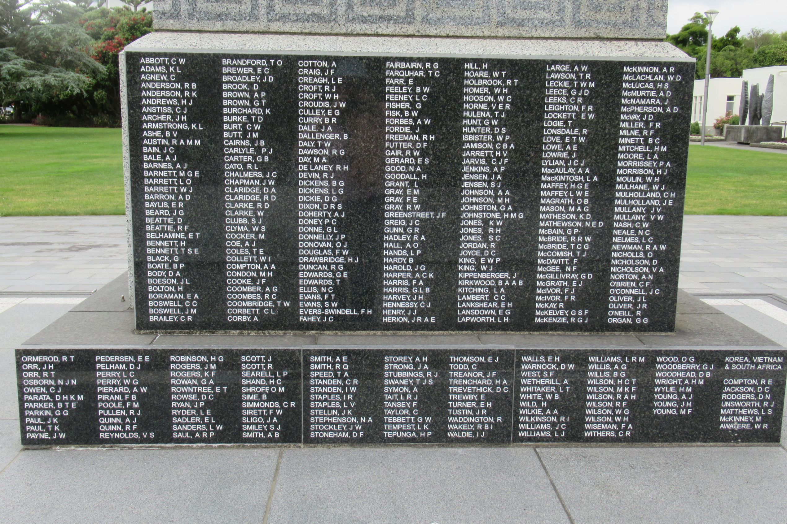 Inscription details Inscription ID:1709 Brief Description:War Memorial, Lower Hutt, NZ Type:War Memorial Detail:Recognition of those dying in active service in Second World War, Malaya and Malaysia, Korea, and Vietnam Inscription:NZ RETURNED SERVICES ASSOCIATION IN GRATEFUL MEMORY OF THOSE NEW ZEALANDERS WHO DIED ON ACTIVE SERVICE FOR THEIR COUNTRY IN THE SECOND WORLD WAR 1939 - 45, MALAYA AND MALAYSIA 1948 - 60, KOREA 1950 - 53, VIETNAM 1964 - 72 Place:Lower Hutt War Memorial Library, Wellington Metro Area County:North Island Country:New Zealand Date:1939-1972 Contributor:Marilyn Astle Photo(s):LowerHutt1NZ_270725.jpgLowerHutt2NZ_270725.jpg Names:View all names on inscription Do another search