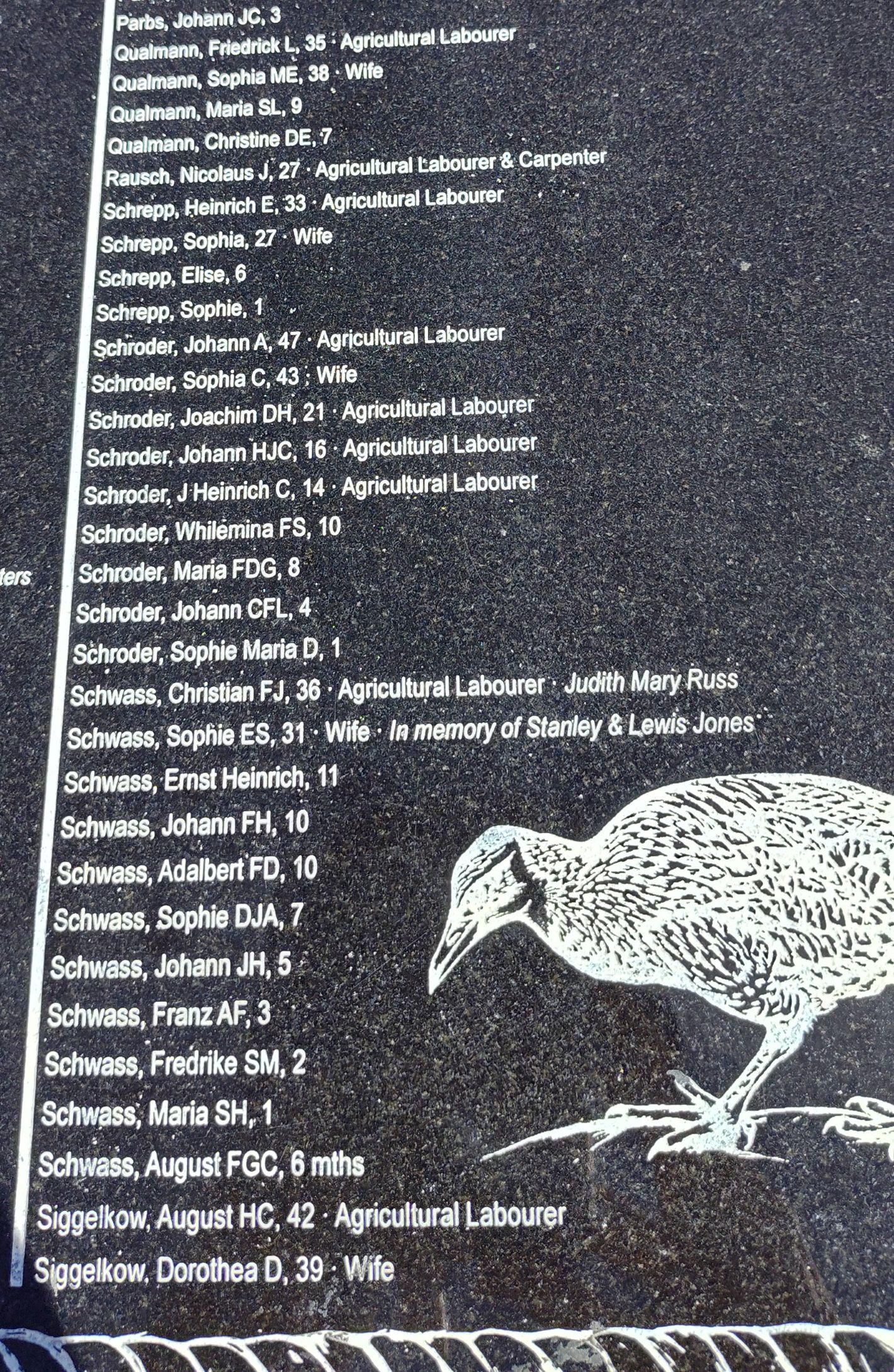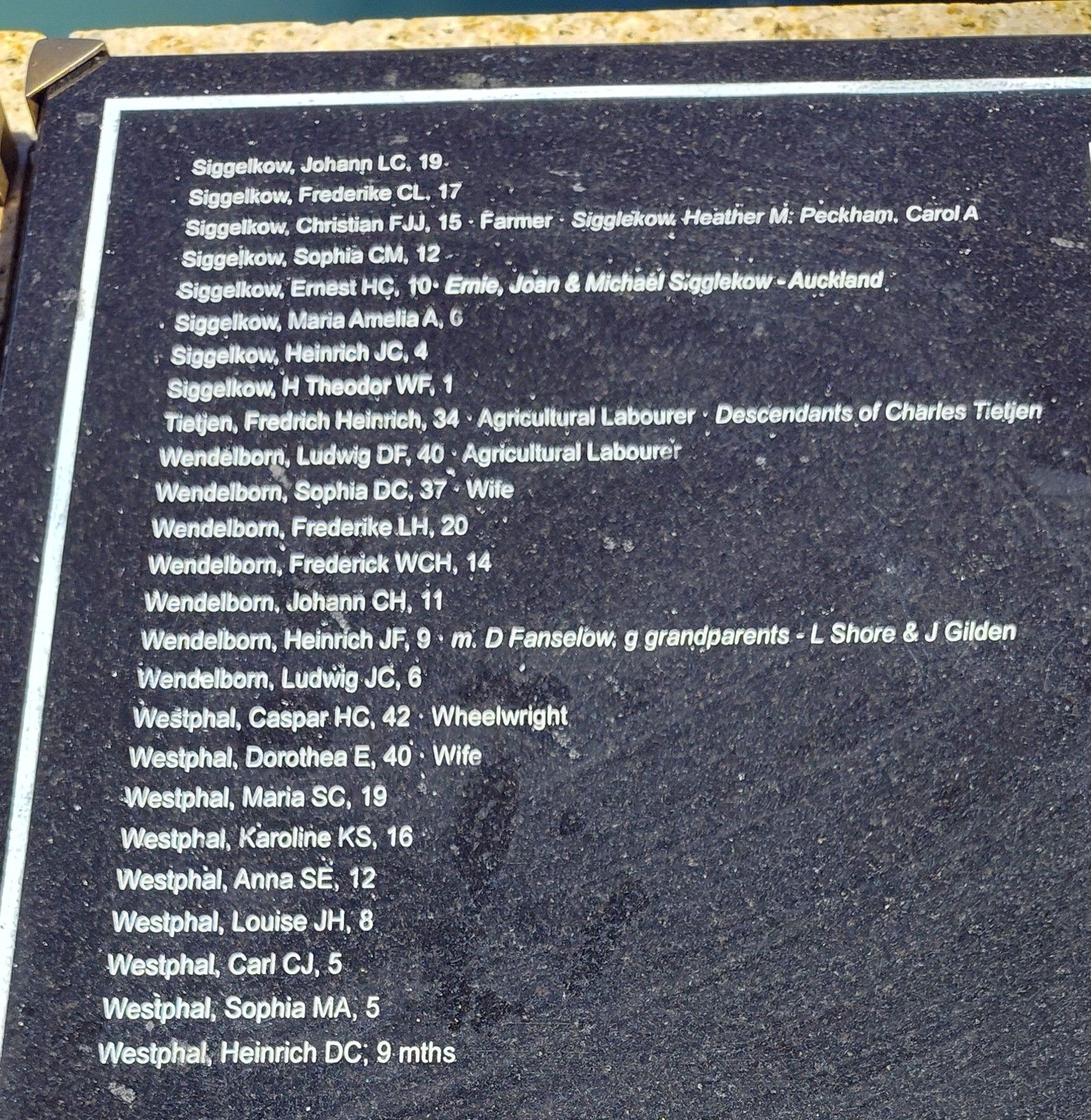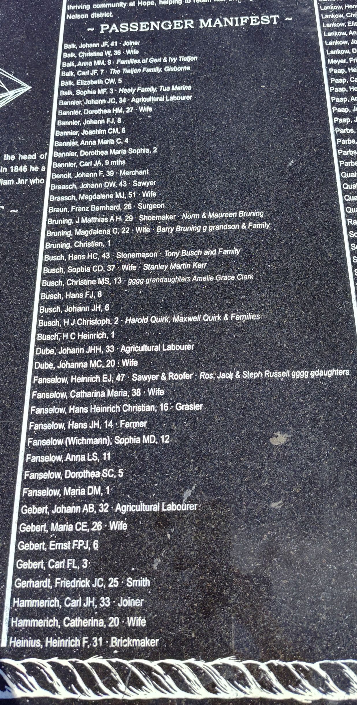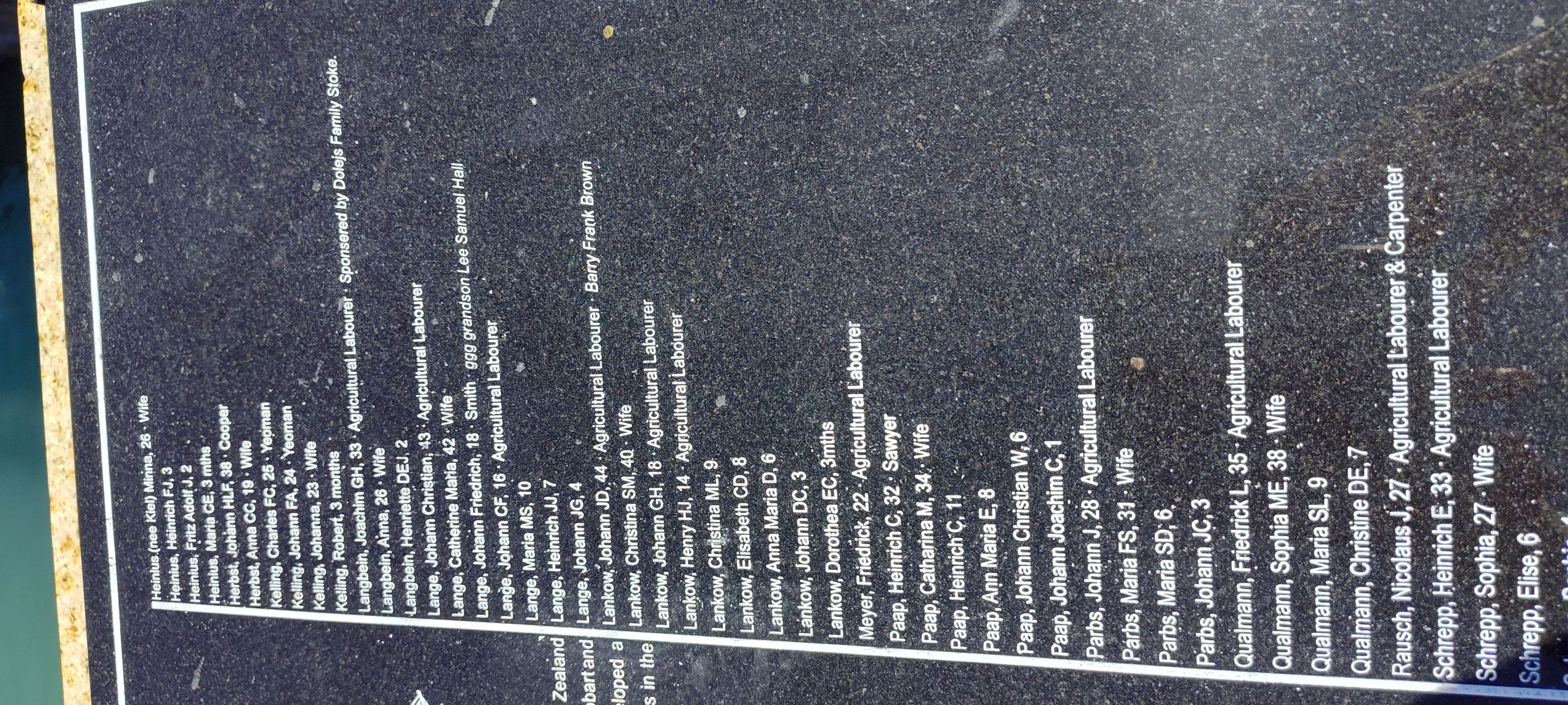 Inscription details Inscription ID:1953 Brief Description:Skiold passenger list, Nelson, New Zealand Type:Plaque Detail:Part of a series of engraved granite panels listing ships and passengers arriving 1841-1850 Inscription:SKIOLD [ 1-09-1844] This second group of German setters arrived to a shortage of New Zealand Company allotments. Within a year half left for German settlements in Hobart and Adelaide. [See photo for more detail.] Place:The Wharf, Nelson County:South Island Country:New Zealand Date:1844-2000 Contributor:Marilyn Astle Photo(s):Skiold1NZ_220226.jpgSkiold2NZ_220226.jpgSkiold3NZ_220226.jpgSkiold4NZ_220226.jpgSkiold5NZ_220226.jpg Names:View all names on inscription Do another search