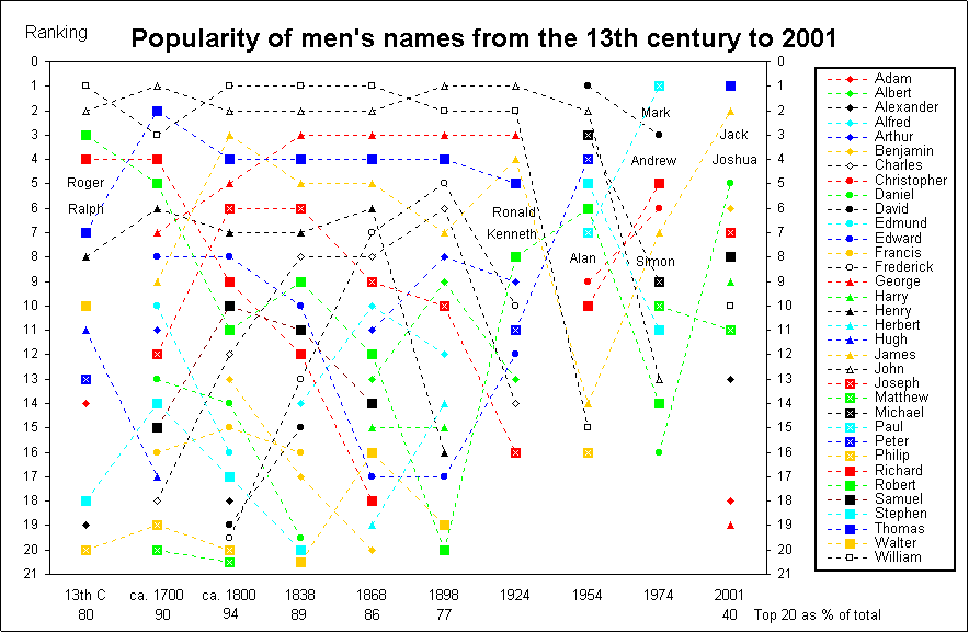 Men’s names Romeo, Romeo, wherefore art thou Romeo? Robert and Roger as names are just as sweet… Popularity of men’s names over the centuries by Donald Hatch (After seven centuries in the top 20 Robert declined to 39th place in 2001) In 2001 there were as many as two thousand forenames in use in England, which means that it will be relatively easy in the future to trace individuals; even the commonest names such as John Smith, Jack Jones or Tom Brown are currently held by only about one man in one hundred thousand. Only one in 3600 future weddings will be between a William and a Katie, the 10th most common forenames in 2001 (assuming they do actually marry… ). Second names are also general, which further helps to distinguish between persons. If however we go back to the Victorian period, we discover that the number of names in common use was much smaller and only a minority of new-borns were registered with a second forename. In earlier centuries, the range was even more limited. We all know of the problems of differentiating those Johns and Sarahs, Thomases and Elizabeths. This article deals with changes in the popularity of men’s names in England. The sources of the information will be given in a second article covering women’s names. To deal with the particular problem of the treatment of the various spellings in use for the same name, I have chosen to treat homonyms (names with the same sound but different spellings) as one name, e.g. Sydney and Sidney, Ann and Anne. In addition commonly used diminutives have been counted under the full name, Tom as Thomas, Joe as Joseph, Ellie as Ellen, etc. The 13th, 17th and 18th centuries Based on a sample of 4000 Essex names in the 13th century and somewhat smaller samples from three Buckinghamshire parishes in the 17th and 18th centuries, as few as ten names accounted for 62% of all baptisms in the 13th century and as many as 78 to 86% in the 17th and 18th centuries. Second forenames were virtually unknown amongst the common people. 13th century* 17th century** (Late) 18th century*** Frequency in 2001, % Rank Name % Cum. % Name % Cum. % Name % Cum. % Names in: 13th C 17th C 18th C 1 William 13 13 John 22 22 William 20 20 1.8 0.4 1.8 2 John 10 23 Thomas 16 38 John 16 36 0.4 3.2 0.4 3 Robert 9 32 William 16 53 James 11 48 0.7 1.8 3.2 4 Richard 8 40 Richard 7 60 Thomas 11 59 0.2 0.2 3.2 5 Roger 4 44 Robert 5 65 Joseph 7 66 – 0.7 2.2 6 Ralph 4 48 Henry 3 68 George 7 72 0.03 1.3 0.4 7 Thomas 4 52 George 3 71 Henry 4 76 3.2 0.4 1.3 8 Henry 4 55 Edward 3 74 Edward 4 80 1.3 0.6 0.6 9 Geoffrey 3 58 James 2 76 Richard 3 83 0.02 *4007 names from the Essex Feet of Fines, (with modernised spellings, e.g. John for Iohannis) **1682 baptisms at Beaconsfield, Whaddon and Little Woolstone *** 664 baptisms at Beaconsfield and Little Woolstone 13th century All the names listed, and indeed all the top 20 are in common use today. There are however a number of names that occurred rarely in the 13th century (about 5 occurrences in 1000) which are now unknown, such as Baldwin, Osbert, Ranulf, and Sawal. Less common still were Alured, Ernulf, Fulk, Hamo, Imbert, Odo, Pagan and Saher. Of the 110 names occurring more than once in the 13th century sample, about 40 are now obsolete. 17th century There is little change in four centuries and all of the commonest 17th century names are in use today, even Edmund. Of the 90-odd names in the sample only a few have become obsolete; Calib, Lazerus and Obadiah being examples. The less common names were often Biblical. Late 18th century Once again there was little change in the choice of names in a conservative rural England. Second names were still very rare and the concentration on a few popular names was even more marked, 86% of all males sharing the top 10 names in this small sample of baptisms. The Biblical names still dominated the other 14%. There was a King George on the British throne from 1714 to 1830 which may have contributed to the continuing popularity of this name. It remains curious that in spite of the large families which would suggest the need for a larger range of names, parents actually often chose to give a child a name already given earlier to a brother or sister who had died in infancy. The practice of giving the parents’ names to the first boy and girl also tended to limit the range of names in use. The Victorian period The great social and industrial changes in England in this period were also marked by major changes in the use of forenames. The excellent FreeBMD data base of civil registrations since 1837 allowed large samples to be analysed; 52000 men who married between 1867 and 1886 (and were therefore born in the early Victorian period) and separate samples of about 2500 male births at 15 year intervals from 1838 to 1893. The larger sample of 52000 men yielded 502 different names, and although the top 10 still accounted for 72% of the total, one in a hundred men shared about 300 separate names, most of which are still in use today. Some indeed, once rare, have become commonplace; see under “Losers and winners”. The table shows the development of the top 10 in Victorian England:- Table 2 – Most common names given in the Victorian period Rank 1838 1853 1868 1883 1898 Bridegrooms1867-86 1 William William William John John William 2 John John John William William John 3 George Thomas George George George Thomas 4 Thomas George Thomas Thomas Thomas James 5 James James James James Frederick George 6 Joseph Henry Henry Arthur Charles Henry 7 Henry Charles Frederick Charles James Joseph 8 Charles Joseph Charles Frederick Arthur Charles 9 Robert Robert Joseph Joseph Albert Robert 10 Edward Samuel Alfred Albert Joseph Edward % top 10 77% 74% 66% 58% 55% 72% No. ofnames intop 99% 93 107 124 130 132 184 The 20th century More and more names came into use, and the rankings began to show marked fluctuations especially after 1945. Table 3 indicates movements in the most popular names during the co