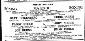 Persons of Interest – George Siegenberg Posted 22 October 2018 by Tessa KeoughGeorge Siegenberg (also spelled Seigenberg) was born on 21 February 1913 in Salford, Lancashire. He was the son of a dock labourer, Benjamin Siegenberg, who had been born in London in 1863 and used the surname Carter, possibly after marrying Mary Carter in 1890 (no marriage record has been found). Most of their twelve children died young. These Siegenbergs are one of my islands – a branch that I have not yet been able to connect to all the others, who descend from Jonas/Jonah Siegenberg, a pencil maker in Spitalfields, and his wife Bluma. (One day I will order the birth certificate for Benjamin and solve the puzzle.) George married Agnes Booth in Salford in 1937, and they can be seen in the 1939 Register where George is described as a general labourer. Thanks to a Google Alert, I discovered George listed on a website called BoxingHistory.org.uk. This told me that he was a professional boxer, known as Battling Seigenberg, active between 1933 and 1936. Public Notice – Majestic Boxing Several newspaper accounts can be found mentioning his boxing contests in Lancashire, including this one, where it says he comes from Denmark and fights as “The Castiron Dane”! George died on 8 June 1957. On the second and fourth Mondays of each month, we share a short story provided by a member about a person of interest in their one-name study. Whether your person is good, bad, or simply interesting or unusual, please send us your story. This post is from Guild member Jessica Feinstein. Why not submit a story (200-300 words OR a bit longer if need be) about a person of interest in your own one-name study. Email each story and image(s) to marketing@one-name.org.