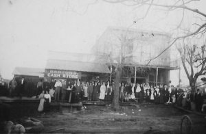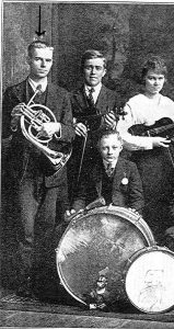 Persons of Interest – Ralph Fred Barton Posted 14 May 2018 by Tessa KeoughPersons of Interest On the second and fourth Mondays of each month, we share a short story provided by a member about a person of interest in their one-name study. So whether your person is good, bad, or simply interesting or unusual, please send us your 200-300 word story with one or a few images. This post is from Guild member Gary Barton. In the forty-four years that I knew him, my father never mentioned that he had played a musical instrument or sang in a choir at any time during his lifetime. Imagine my surprise to learn otherwise while on a multi-state genealogical research expedition! Ralph Fred Barton (1903-1987) (pictured on the left holding the mellophone) was born on November 22, 1903, on the family farm in Hume, Bates Co., Missouri[i],[ii]. His father, Fred Barton, was a graduate of Illinois State Normal University[iii], had been a teacher at the Huffman School in Marshall County, Illinois[iv], and the principal of Odell High School, Odell, Livingston Co., Illinois[v]. Fred Barton and Nancy Anna “Anna” (Huffman) Barton, had moved some 500 miles from Saratoga Twp., Marshall Co., Illinois, to Hume in 1903, and purchased 80 acres of rich, rolling farmland[vi]. Little Ralph joined the family consisting of mother, father, and ten-year-old half-brother Isaac Truman Barton and thirteen year-old half-sister Stella Joy Barton (the children of Fred and his first wife Sarah Louise Creadle Rogers who died in 1898)[vii]. Like his own father, Fred was a successful farmer accumulating enough capital to finance another change of careers. In 1909 he purchased a half-interest in the Dickinson Store in Hume[viii]. Fred sold his interest in the store in the spring of 1910, sold his farmstead in Hume in June of the same year[ix] and moved fourteen miles north to Amoret, Bates County, Missouri, in October of 1910 where he established Bartons Cash Store, a general mercantile shop. Bartons Cash Store is pictured below with (probably) the entire population of Amoret posed in front. Tragedy struck the family on January 6, 1911, when gasoline stored in the lighting plant within the store exploded, instantly killing Isaac and one other worker and burning Fred and Anna. The force of the explosion snuffed out lingering flames as the building was saved[x]. Fred sold the business in 1915 and moved the family fifty miles across the border to the rural township of Colony, Anderson County, Kansas, where he purchased 154 acres for $12,000 and resumed farming[xi]. It’s there that thirteen-year-old Ralph entered Colony High School in 1916 and started his high school education. Did he play an instrument or sing in a choir then? We don’t know for sure. However, it’s possible since he had been raised by a piano-teacher mother who enjoyed playing the piano and organ throughout her lifetime (Anna was mentioned in the newsletter of her convalescent home while in her late eighties as “playing a pump organ even though sightless in one eye and partially sighted in the other”)[xii]. A hard earthquake struck Colony in early 1919 resulting in the condemnation and demolition of Colony High School. Would Ralph continue his education? Where and how? It’s a measure of the importance that Fred and Anna accorded to continuing Ralph’s education, as well as his own maturity and brightness, that Ralph was sent some 120 miles away to the nearest large city, Carthage, Missouri, where he entered Carthage High School in September 1919 to begin his senior year[xiii]. Just sixteen years old and living in another state far away from home! There is no record of whether he lived with relatives [none are known to have been in or near Carthage] or truly on his own although the latter seems likely. Making new friends, continuing his education, and enjoying the stimulation of living in a city rather than on a farm with the attendant new experiences marked Ralph’s life in Carthage, Missouri, during the 1919-1920 school year. It was during my visit in 2006 to Carthage that I came across his fragile high school class annual wherein the above photo of Dad and his mellophone leaped off the page to me. Elsewhere, in the annual I learned that he had sang in the Glee Club, participated in the Debate Club (the May 13th, 1920, edition of The Carthage Evening Press reported that he and a teammate had lost a debate on the negative position of “Resolved: That the United States Should Immediately Declare War on Mexico”)[xiv], the Hi-Y Club and the Athletic Association[xv]. Dad must have had fond memories of his senior year at Carthage High School as I remember in 1970 while living in Whittier, California, that he flew back to Carthage, Missouri, to attend his fiftieth-class reunion. Did he sing songs or pick up an instrument that evening? I don’t know and can only speculate. I do know, though, that one time in his life Dad was in a band! www.bartonsite.org www.bartondatabase.com NOTES [i] “Memoirs of Mrs. Rachel Minerva (Owsley) Barton”, ca 1916, personal files of Gary M. Barton [ii] Biography of Ralph Fred Barton by his son Alan Lee Barton, 21 Jan 1949, personal files of Gary M. Barton [iii] Illinois State Normal University, Semi-Centennial History 1857-1907, (n.p., n.pub., 1907) [iv] “Ancestors of Cornelius Huffman Also Descendants”, MS, undated, Longmont CO [v] High School Commencement Announcement, Odell High School, June 13, 1890, personal files of Gary M. Barton [vi] Elizabeth Nickolls Laidman, The Story of Cornelius Huffman His Contemporaries and His Descendants, n.p., self-published, March 1964, hereafter referred to as Story of Cornelius Huffman [vii] Stella Joy (Barton) Kinter, “Rogers Family Genealogical Notes”, Oct. 6, 1961, personal files of Gary M. Barton [viii] Burned To Death, The Border Telephone, Hume, Kansas, Jan. 13, 1911, pg. 1 [ix] DEED: Fred Barton and his wife Anna H. Barton to L. G. Williams, Book 226, pg. 37, Bates Co. MO 