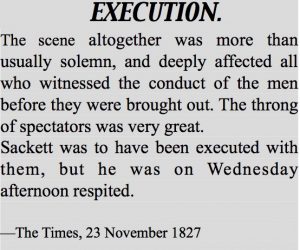 Persons of Interest – Thomas Baker Sackett Posted 8 October 2018 by Tessa KeoughOn 13 September 1827, at London’s central criminal court, the Old Bailey, Thomas Baker Sackett was found guilty of assaulting and robbing a bank clerk. His sentence for this crime was death by hanging. His execution was set to take place two months later on 22 November at the notorious Newgate Gaol. There being no right of appeal, Thomas’s only hope was to petition the King, George IV, for his royal mercy. Following frantic efforts by a number of concerned worthies who petitioned on his behalf, he was at last granted a respite—but then only at the second attempt and with only hours to go before his appointment with the hangman. His sentence was reduced to transportation for life to the convict colony of New South Wales. Thomas Baker Sackett – Notice Thomas Baker Sackett (1796–1837) was born in Essex to calves’ salesman Thomas Sackett and his wife Rachel Baker. With a substantial inheritance from his grandfather, the younger Thomas took a farm near Billericay, but the venture failed. He returned to his former trade, setting up shop as a butcher in London’s Whitechapel district. Later the same year, his wife died aged 26. His butcher shop also failed. Thomas survived the harsh conditions in the penal colony of New South Wales for nine years, and died there aged 41 in 1837. On the second and fourth Mondays of each month, we share a short story provided by a member about a person of interest in their one-name study. Whether your person is good, bad, or simply interesting or unusual, please send us your story. This post is from Guild member Chris Sackett. Why not submit a story (200-300 words OR a bit longer if need be) about a person of interest in your own one-name study. Email each story and image(s) to marketing@one-name.org.