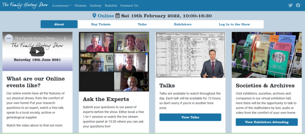 The Family History Show ~ 19 February 2022 Posted 15 February 2022 by Julie GoucherScreenshot of The Family History Show website. The next online Family History Show https://thefamilyhistoryshow.com is this coming Saturday, 19 February. There are about 100 booths, mostly of UK family history societies, and including the Guild. It’s a great opportunity to visit their booths and meet other members. You can see the exhibitors before deciding whether to buy a ticket, at https://thefamilyhistoryshow.com/online/exhibitors/ There are also talks and ask the expert sessions, so plenty to do throughout the day. The Guild members giving talks are Mia Bennett, Jackie Depelle, Else Churchill and Debbie Kennett. The associated Family History Fairs later in the year, at York and London (Kempton Park), are scheduled to be in person events” Text from Wendy Archer, with thanks.