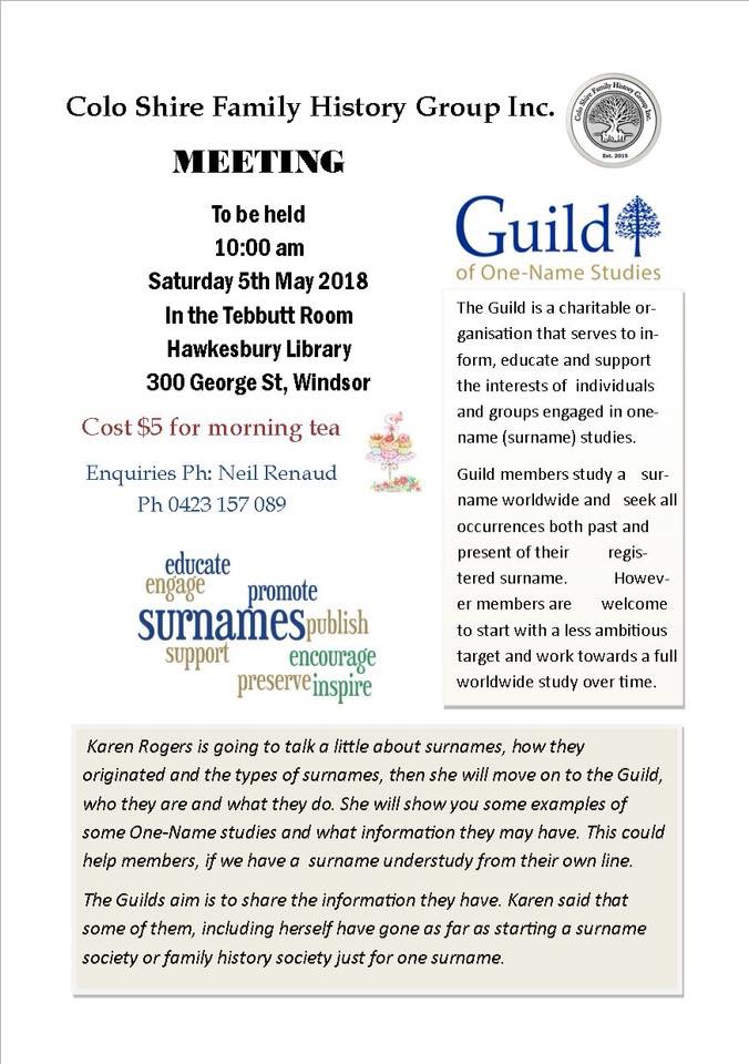 The Guild at Colo Shire Family History Group, New South Wales, Australia Posted 25 April 2018 by Julie GoucherGuild Member, Karen Rogers who runs the Liddiard One-Name Study will be speaking at the Colo Shire Family History Group in New South Wales, Australia on 5th May 2018.